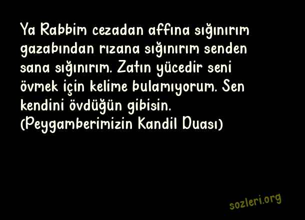 Ya Rabbim cezadan affına sığınırım gazabından rızana sığınırım senden sana sığınırım. Zatın yücedir seni övmek için kelime bulamıyorum. Sen kendini övdüğün gibisin. (Peygamberimizin Kandil Duası) ( Kadir Gecesi )