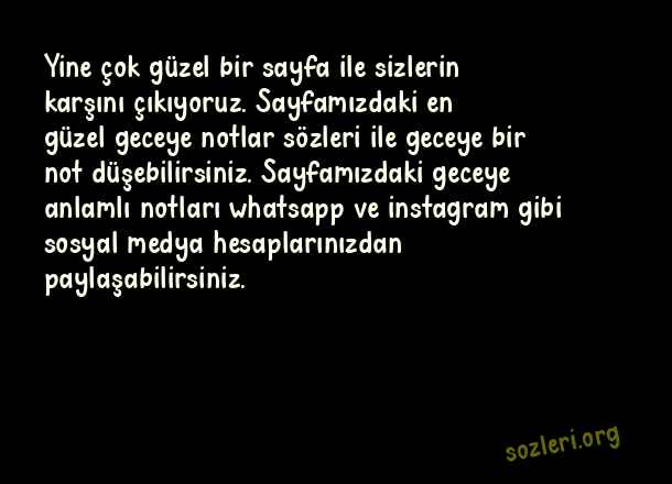 Yine çok güzel bir sayfa ile sizlerin karşını çıkıyoruz. Sayfamızdaki en güzel geceye notlar sözleri ile geceye bir not düşebilirsiniz. Sayfamızdaki geceye anlamlı notları whatsapp ve instagram gibi sosyal medya hesaplarınızdan paylaşabilirsiniz. ( Geceye Notlar )