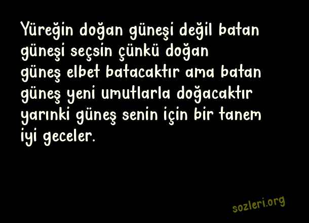 Yüreğin doğan güneşi değil batan güneşi seçsin çünkü doğan güneş elbet batacaktır ama batan güneş yeni umutlarla doğacaktır yarınki güneş senin için bir tanem iyi geceler. ( İnstagram İyi Geceler )