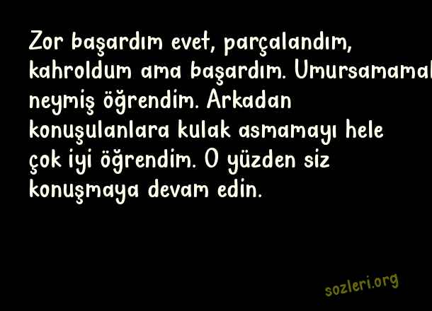 Zor başardım evet, parçalandım, kahroldum ama başardım. Umursamamak neymiş öğrendim. Arkadan konuşulanlara kulak asmamayı hele çok iyi öğrendim. O yüzden siz konuşmaya devam edin. ( Geceye Notlar )