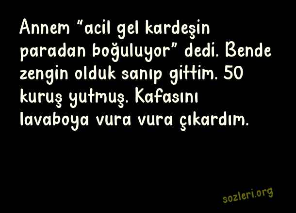 Annem “acil gel kardeşin paradan boğuluyor” dedi. Bende zengin olduk sanıp gittim. 50 kuruş yutmuş. Kafasını lavaboya vura vura çıkardım. ( Geyik Sözler )