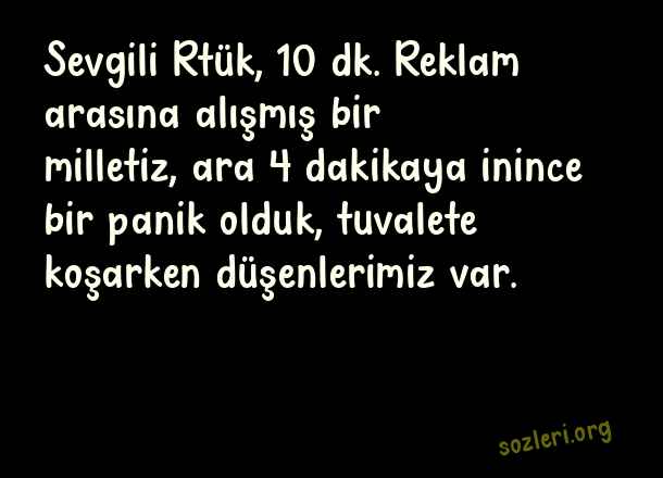 Sevgili Rtük, 10 dk. Reklam arasına alışmış bir milletiz, ara 4 dakikaya inince bir panik olduk, tuvalete koşarken düşenlerimiz var. ( Geyik Sözler )