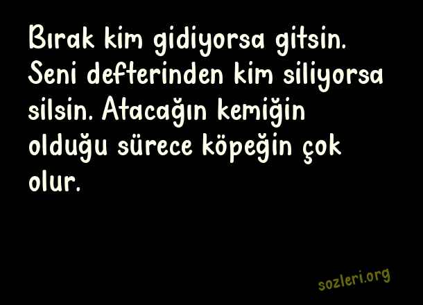 Bırak kim gidiyorsa gitsin. Seni defterinden kim siliyorsa silsin. Atacağın kemiğin olduğu sürece köpeğin çok olur. ( Giden Sevgiliye Sözler )