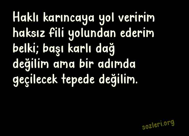 Haklı karıncaya yol veririm haksız fili yolundan ederim belki; başı karlı dağ değilim ama bir adımda geçilecek tepede değilim. ( Giden Sevgiliye Sözler )
