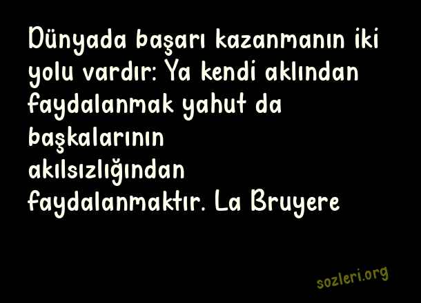 Dünyada başarı kazanmanın iki yolu vardır: Ya kendi aklından faydalanmak yahut da başkalarının akılsızlığından faydalanmaktır. La Bruyere ( Günlük Sözler )