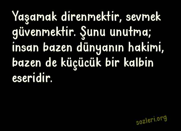 Yaşamak direnmektir, sevmek güvenmektir. Şunu unutma; insan bazen dünyanın hakimi, bazen de küçücük bir kalbin eseridir. ( Hakim )