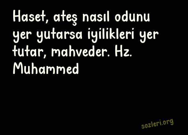 Haset, ateş nasıl odunu yer yutarsa iyilikleri yer tutar, mahveder. Hz. Muhammed ( Haset )