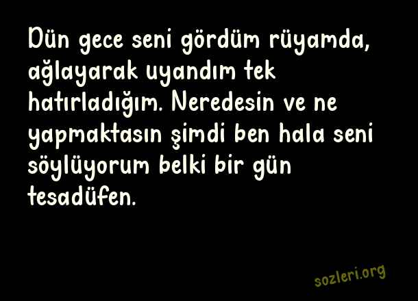 Dün gece seni gördüm rüyamda, ağlayarak uyandım tek hatırladığım. Neredesin ve ne yapmaktasın şimdi ben hala seni söylüyorum belki bir gün tesadüfen. ( Hatırlamak )