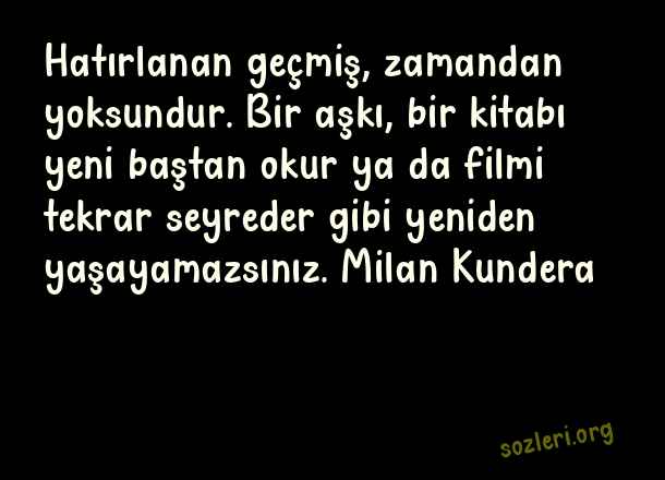 Hatırlanan geçmiş, zamandan yoksundur. Bir aşkı, bir kitabı yeni baştan okur ya da filmi tekrar seyreder gibi yeniden yaşayamazsınız. Milan Kundera ( Hatırlamak )