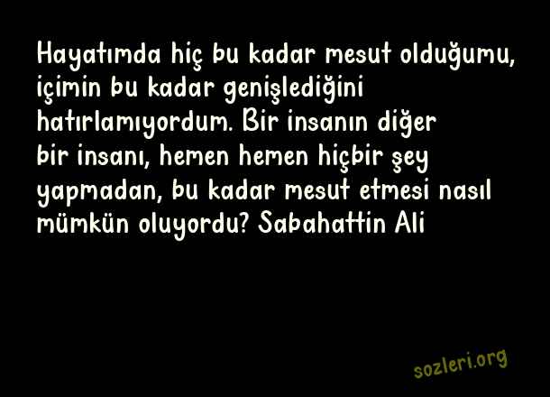 Hayatımda hiç bu kadar mesut olduğumu, içimin bu kadar genişlediğini hatırlamıyordum. Bir insanın diğer bir insanı, hemen hemen hiçbir şey yapmadan, bu kadar mesut etmesi nasıl mümkün oluyordu? Sabahattin Ali ( Hatırlamak )