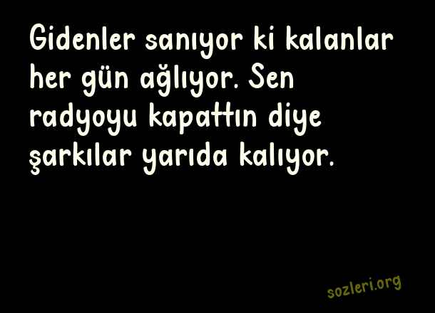 Gidenler sanıyor ki kalanlar her gün ağlıyor. Sen radyoyu kapattın diye şarkılar yarıda kalıyor. ( Havalı Laf Sokucu Sözler )