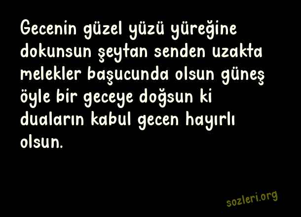 Gecenin güzel yüzü yüreğine dokunsun şeytan senden uzakta melekler başucunda olsun güneş öyle bir geceye doğsun ki duaların kabul gecen hayırlı olsun. ( Hayırlı Geceler )