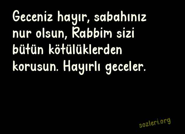 Geceniz hayır, sabahınız nur olsun, Rabbim sizi bütün kötülüklerden korusun. Hayırlı geceler. ( Hayırlı Geceler )