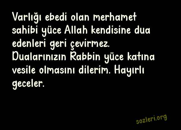 Varlığı ebedi olan merhamet sahibi yüce Allah kendisine dua edenleri geri çevirmez. Dualarınızın Rabbin yüce katına vesile olmasını dilerim. Hayırlı geceler. ( Hayırlı Geceler )