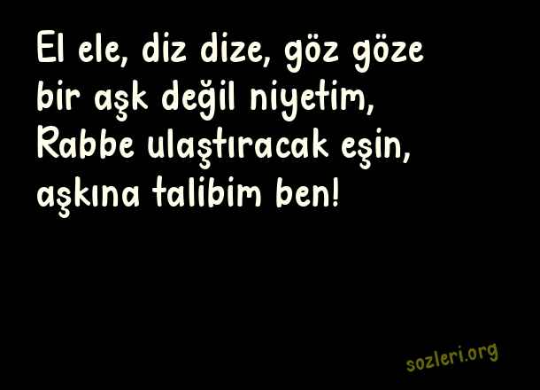 El ele, diz dize, göz göze bir aşk değil niyetim, Rabbe ulaştıracak eşin, aşkına talibim ben! ( Helal Aşk )