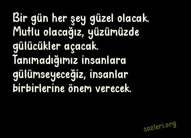 Bir gün her şey güzel olacak. Mutlu olacağız, yüzümüzde gülücükler açacak. Tanımadığımız insanlara gülümseyeceğiz, insanlar birbirlerine önem verecek. ( Her Şey Güzel Olacak )