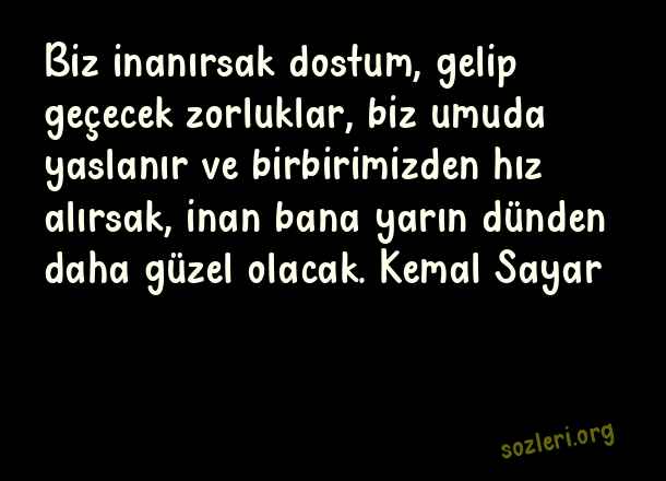 Biz inanırsak dostum, gelip geçecek zorluklar, biz umuda yaslanır ve birbirimizden hız alırsak, inan bana yarın dünden daha güzel olacak. Kemal Sayar ( Her Şey Güzel Olacak )