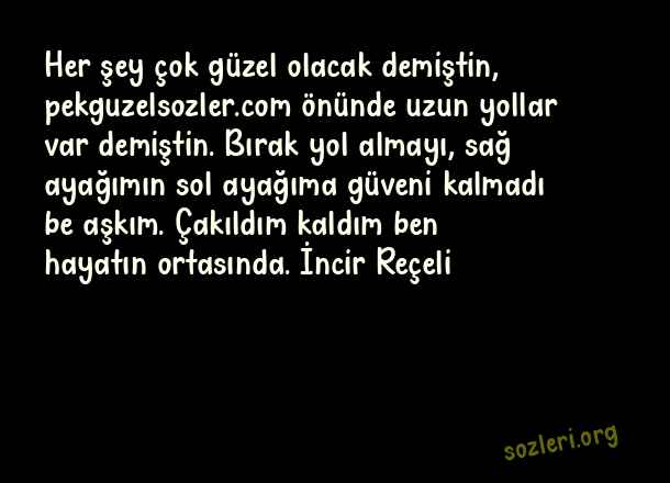 Her şey çok güzel olacak demiştin, önünde uzun yollar var demiştin. Bırak yol almayı, sağ ayağımın sol ayağıma güveni kalmadı be aşkım. Çakıldım kaldım ben hayatın ortasında. İncir Reçeli ( Her Şey Güzel Olacak )