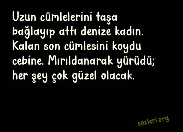 Uzun cümlelerini taşa bağlayıp attı denize kadın. Kalan son cümlesini koydu cebine. Mırıldanarak yürüdü; her şey çok güzel olacak. ( Her Şey Güzel Olacak )