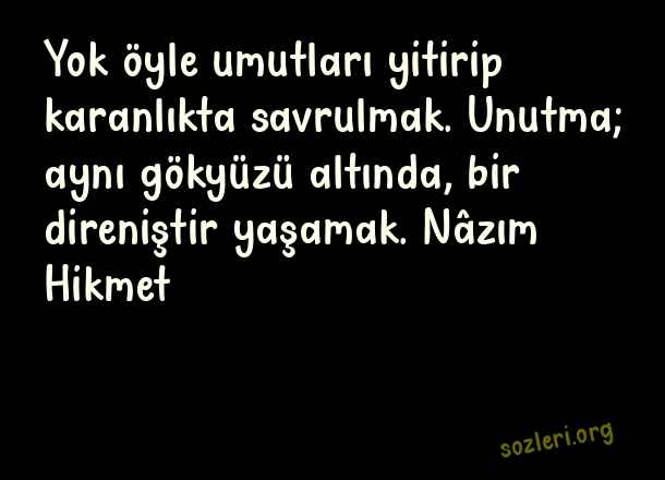 Yok öyle umutları yitirip karanlıkta savrulmak. Unutma; aynı gökyüzü altında, bir direniştir yaşamak. Nâzım Hikmet ( Her Şey Güzel Olacak )