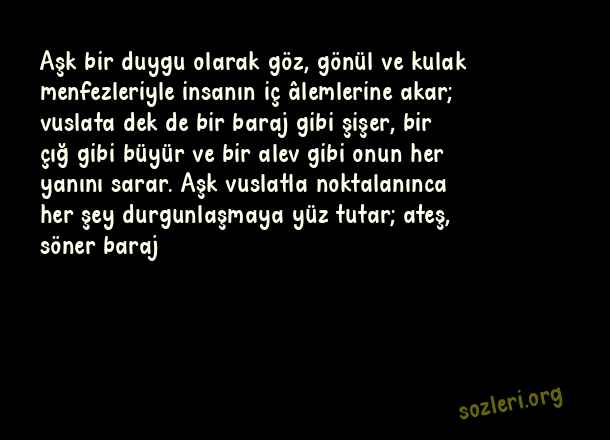 Aşk bir duygu olarak göz, gönül ve kulak menfezleriyle insanın iç âlemlerine akar; vuslata dek de bir baraj gibi şişer, bir çığ gibi büyür ve bir alev gibi onun her yanını sarar. Aşk vuslatla noktalanınca her şey durgunlaşmaya yüz tutar; ateş, söner baraj ( Hoş Sözler )