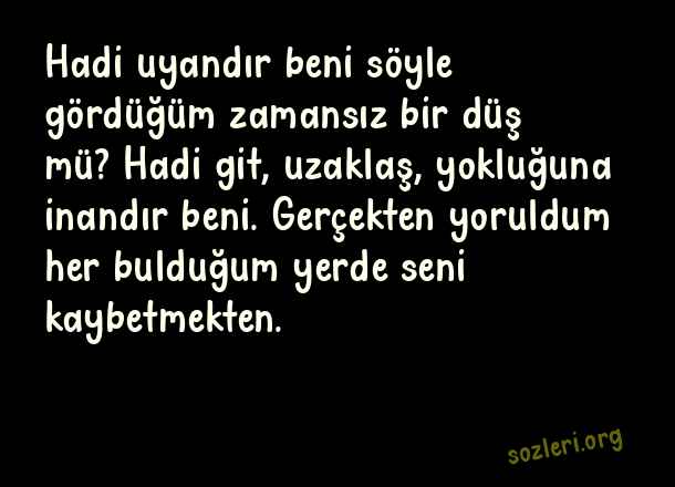 Hadi uyandır beni söyle gördüğüm zamansız bir düş mü? Hadi git, uzaklaş, yokluğuna inandır beni. Gerçekten yoruldum her bulduğum yerde seni kaybetmekten. ( Hoş Sözler )