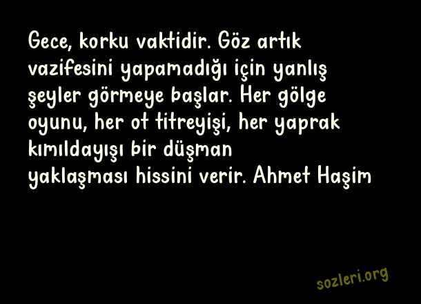 Gece, korku vaktidir. Göz artık vazifesini yapamadığı için yanlış şeyler görmeye başlar. Her gölge oyunu, her ot titreyişi, her yaprak kımıldayışı bir düşman yaklaşması hissini verir. Ahmet Haşim ( Hüzünlü Gece )