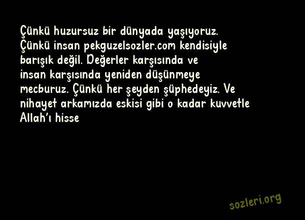 Çünkü huzursuz bir dünyada yaşıyoruz. Çünkü insan kendisiyle barışık değil. Değerler karşısında ve insan karşısında yeniden düşünmeye mecburuz. Çünkü her şeyden şüphedeyiz. Ve nihayet arkamızda eskisi gibi o kadar kuvvetle Allah’ı hisse ( Huzursuzluk )