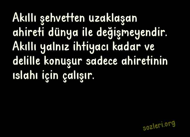 Akıllı şehvetten uzaklaşan ahireti dünya ile değişmeyendir. Akıllı yalnız ihtiyacı kadar ve delille konuşur sadece ahiretinin ıslahı için çalışır. ( Hz. Ali )