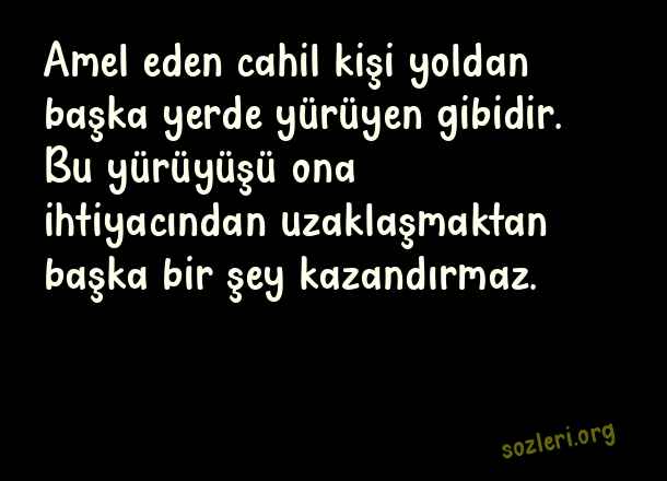 Amel eden cahil kişi yoldan başka yerde yürüyen gibidir. Bu yürüyüşü ona ihtiyacından uzaklaşmaktan başka bir şey kazandırmaz. ( Hz. Ali )