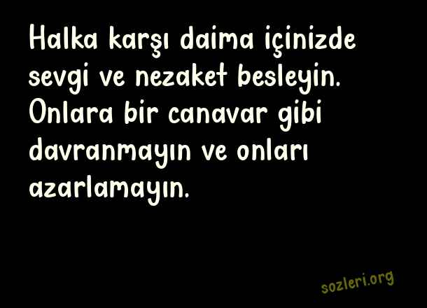 Halka karşı daima içinizde sevgi ve nezaket besleyin. Onlara bir canavar gibi davranmayın ve onları azarlamayın. ( Hz. Ali )