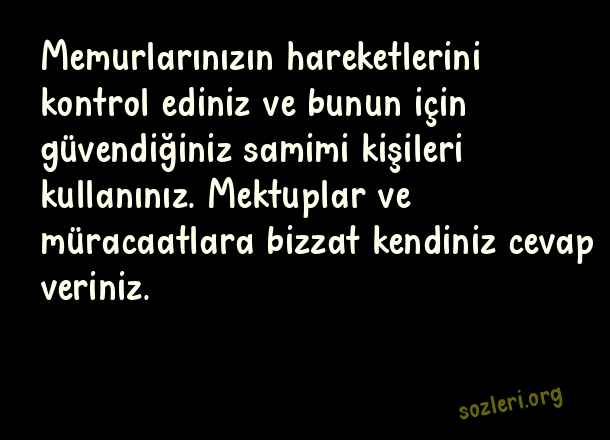 Memurlarınızın hareketlerini kontrol ediniz ve bunun için güvendiğiniz samimi kişileri kullanınız. Mektuplar ve müracaatlara bizzat kendiniz cevap veriniz. ( Hz. Ali )