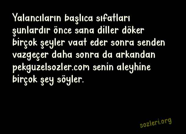 Yalancıların başlıca sıfatları şunlardır önce sana diller döker birçok şeyler vaat eder sonra senden vazgeçer daha sonra da arkandan senin aleyhine birçok şey söyler. ( Hz. Ali )