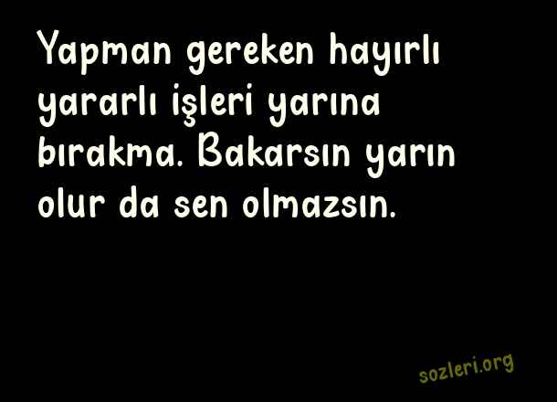 Yapman gereken hayırlı yararlı işleri yarına bırakma. Bakarsın yarın olur da sen olmazsın. ( Hz. Ali )