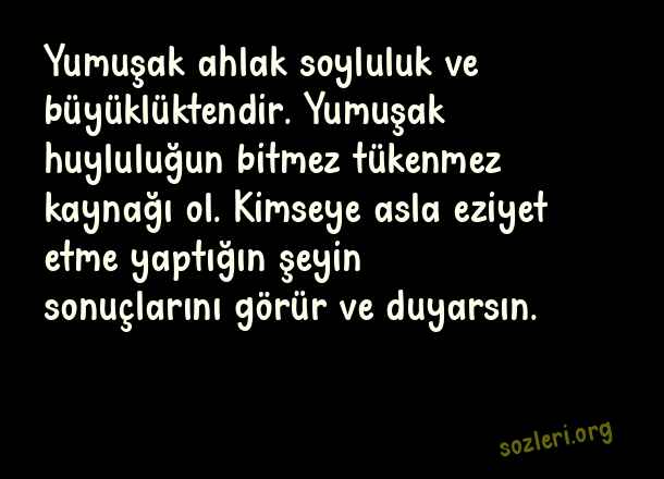 Yumuşak ahlak soyluluk ve büyüklüktendir. Yumuşak huyluluğun bitmez tükenmez kaynağı ol. Kimseye asla eziyet etme yaptığın şeyin sonuçlarını görür ve duyarsın. ( Hz. Ali )