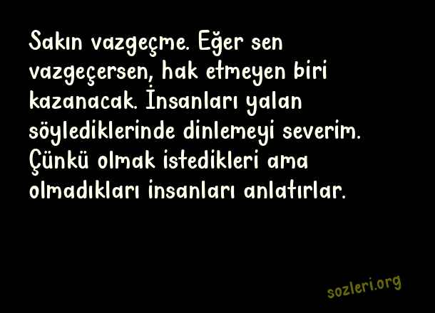 Sakın vazgeçme. Eğer sen vazgeçersen, hak etmeyen biri kazanacak. İnsanları yalan söylediklerinde dinlemeyi severim. Çünkü olmak istedikleri ama olmadıkları insanları anlatırlar. ( İlginç Sözler )