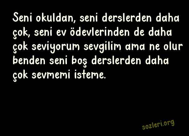 Seni okuldan, seni derslerden daha çok, seni ev ödevlerinden de daha çok seviyorum sevgilim ama ne olur benden seni boş derslerden daha çok sevmemi isteme. ( İnstagram Duvar Yazıları )