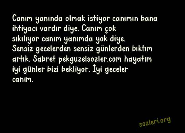 Canım yanında olmak istiyor canımın bana ihtiyacı vardır diye. Canım çok sıkılıyor canım yanımda yok diye. Sensiz gecelerden sensiz günlerden bıktım artık. Sabret hayatım iyi günler bizi bekliyor. İyi geceler canım. ( İnstagram İyi Geceler )