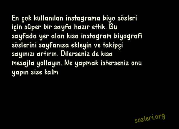 En çok kullanılan instagrama biyo sözleri için süper bir sayfa hazır ettik. Bu sayfada yer alan kısa instagram biyografi sözlerini sayfanıza ekleyin ve takipçi sayınızı artırın. Dilerseniz de kısa mesajla yollayın. Ne yapmak isterseniz onu yapın size kalm ( Kısa İnstagram Biyografi )