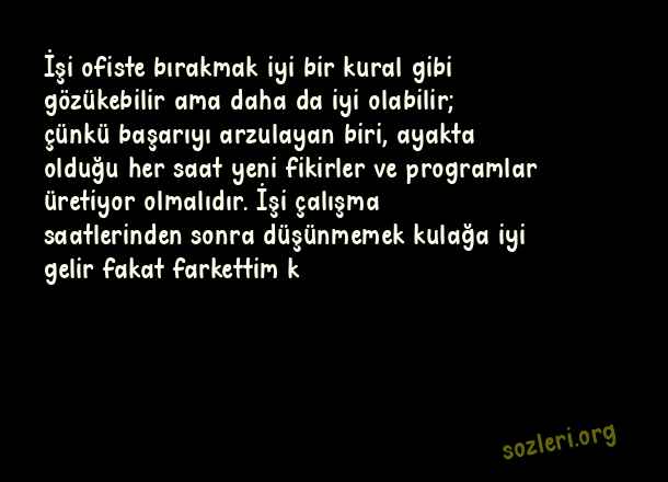 İşi ofiste bırakmak iyi bir kural gibi gözükebilir ama daha da iyi olabilir; çünkü başarıyı arzulayan biri, ayakta olduğu her saat yeni fikirler ve programlar üretiyor olmalıdır. İşi çalışma saatlerinden sonra düşünmemek kulağa iyi gelir fakat farkettim k ( İşyeri )