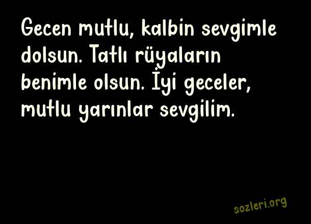 Gecen mutlu, kalbin sevgimle dolsun. Tatlı rüyaların benimle olsun. İyi geceler, mutlu yarınlar sevgilim. ( İyi Geceler Sevgilim )