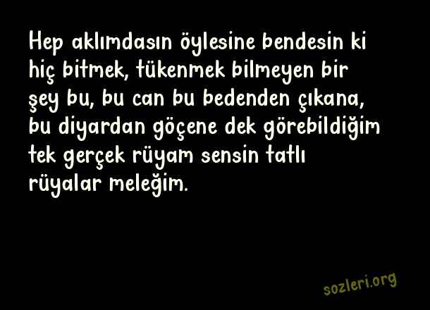 Hep aklımdasın öylesine bendesin ki hiç bitmek, tükenmek bilmeyen bir şey bu, bu can bu bedenden çıkana, bu diyardan göçene dek görebildiğim tek gerçek rüyam sensin tatlı rüyalar meleğim. ( İyi Geceler Yazıları )