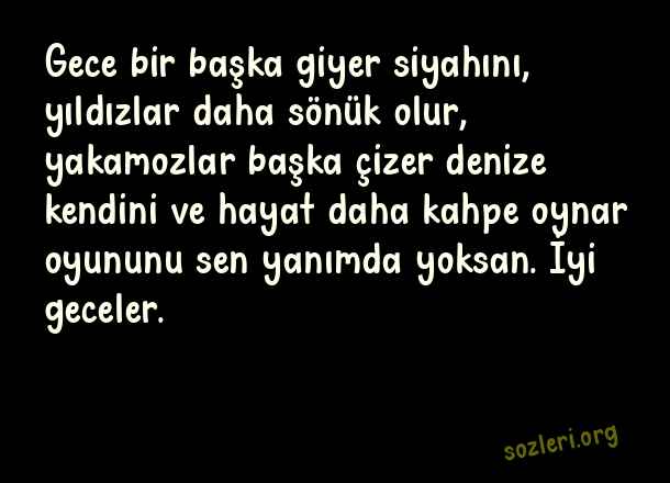 Gece bir başka giyer siyahını, yıldızlar daha sönük olur, yakamozlar başka çizer denize kendini ve hayat daha kahpe oynar oyununu sen yanımda yoksan. İyi geceler. ( İyi Geceler )