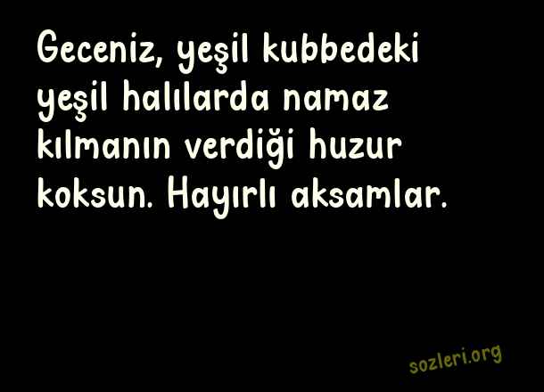Geceniz, yeşil kubbedeki yeşil halılarda namaz kılmanın verdiği huzur koksun. Hayırlı aksamlar. ( İyi Geceler )