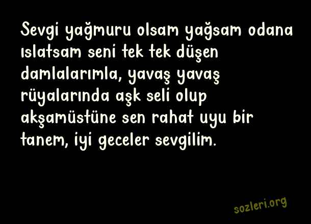 Sevgi yağmuru olsam yağsam odana ıslatsam seni tek tek düşen damlalarımla, yavaş yavaş rüyalarında aşk seli olup akşamüstüne sen rahat uyu bir tanem, iyi geceler sevgilim. ( Sevgiliye İyi Geceler )