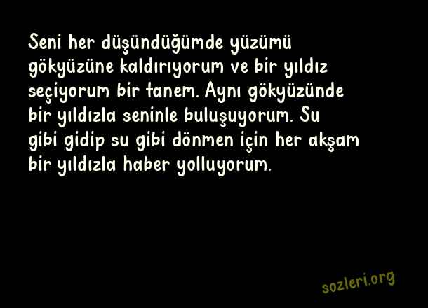 Seni her düşündüğümde yüzümü gökyüzüne kaldırıyorum ve bir yıldız seçiyorum bir tanem. Aynı gökyüzünde bir yıldızla seninle buluşuyorum. Su gibi gidip su gibi dönmen için her akşam bir yıldızla haber yolluyorum. ( İyi Yolcuklar )