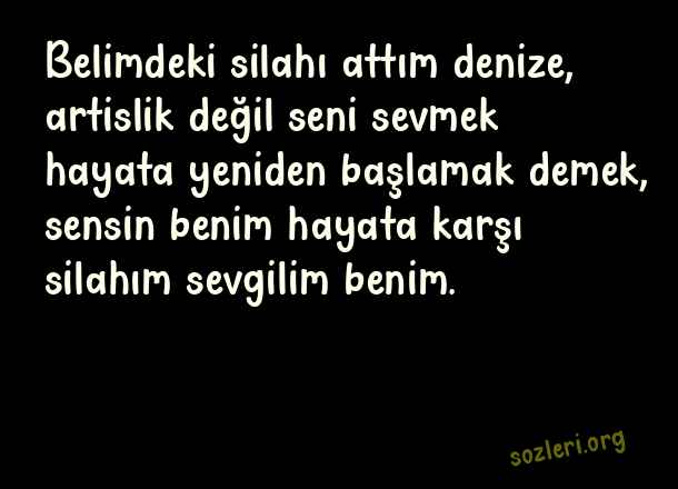 Belimdeki silahı attım denize, artislik değil seni sevmek hayata yeniden başlamak demek, sensin benim hayata karşı silahım sevgilim benim. ( Kabadayı )