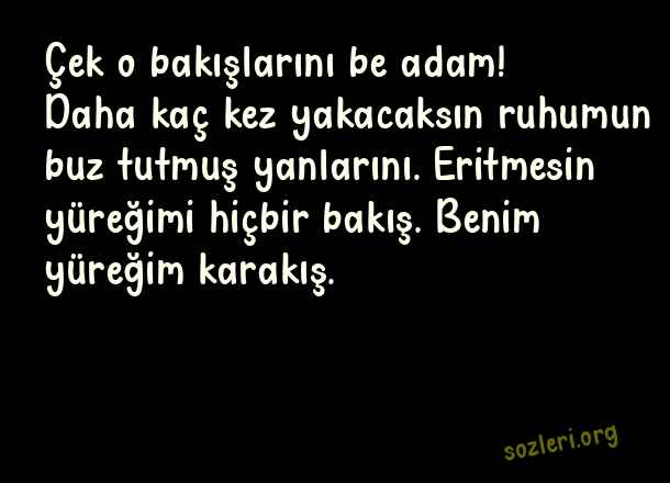 Çek o bakışlarını be adam! Daha kaç kez yakacaksın ruhumun buz tutmuş yanlarını. Eritmesin yüreğimi hiçbir bakış. Benim yüreğim karakış. ( Kabadayı )
