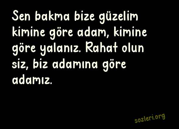 Sen bakma bize güzelim kimine göre adam, kimine göre yalanız. Rahat olun siz, biz adamına göre adamız. ( Kabadayı )