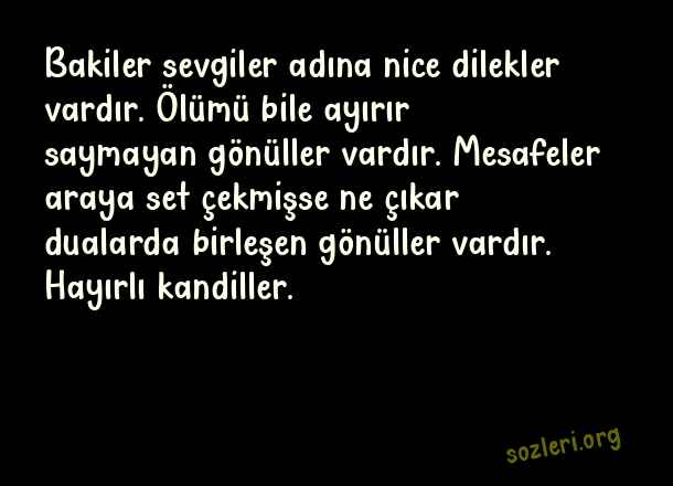 Bakiler sevgiler adına nice dilekler vardır. Ölümü bile ayırır saymayan gönüller vardır. Mesafeler araya set çekmişse ne çıkar dualarda birleşen gönüller vardır. Hayırlı kandiller. ( Kadir Gecesi İçin Güzel Sözler )